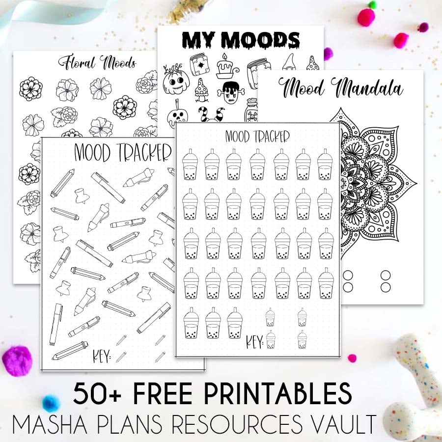I created several different themed mood trackers, so you can find something that works for you and whatever theme you’re doing in your journal.
