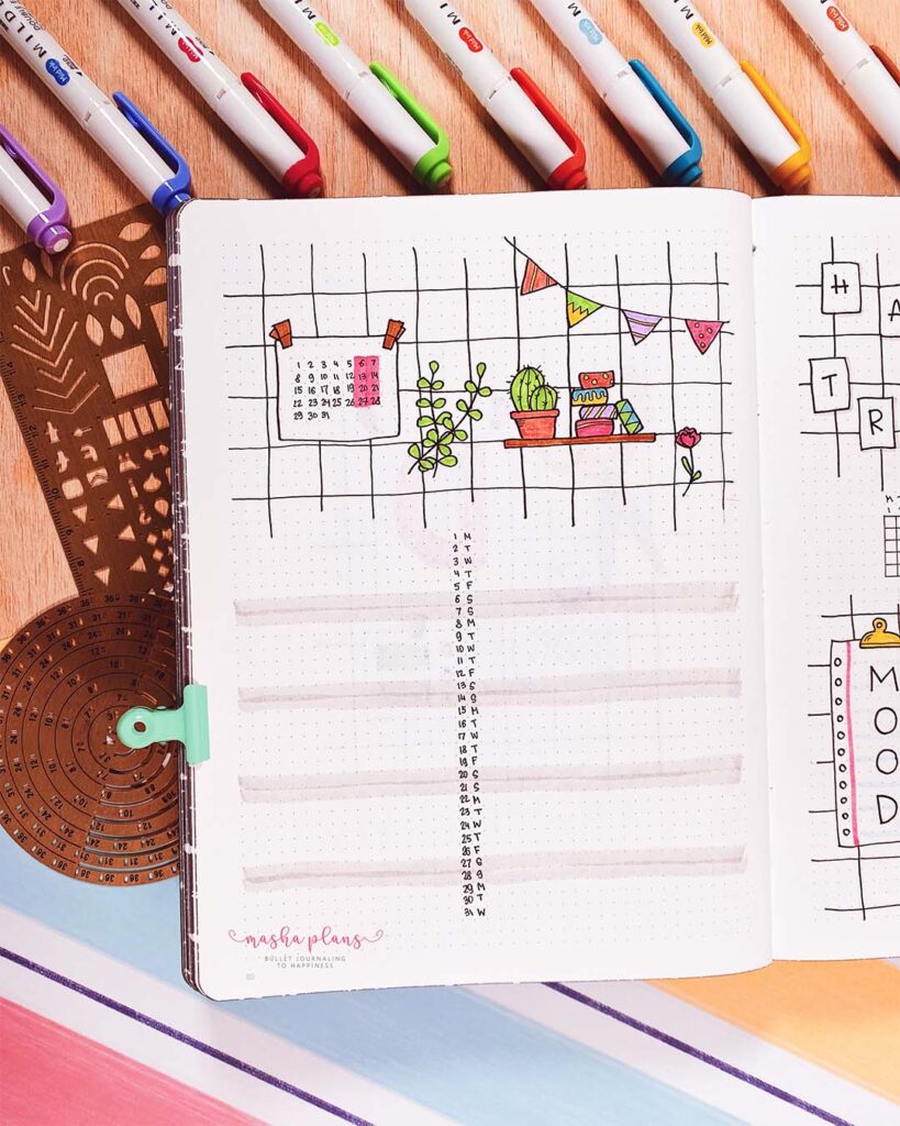 In the end, I got inspired by a printable monthly setup I created a few years ago (this May Bullet Journal Setup), and I decided to recreate it in my actual Bullet Journal.