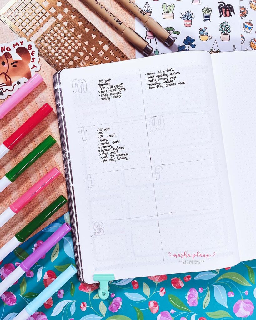 I do prefer vertical weekly pages, but this horizontal one is very easy to set up because I already have the measurements, and it’s easy to draw even without rulers.