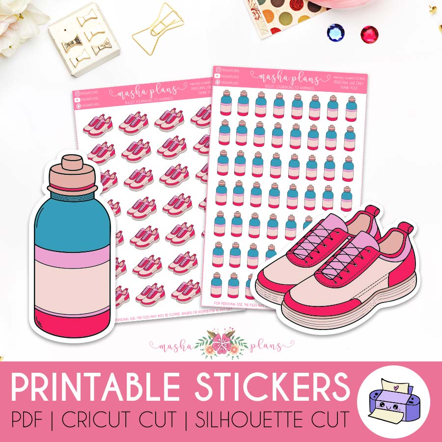 Printable fitness stickers to use in your Bullet Journal, planner, or scrapbook.