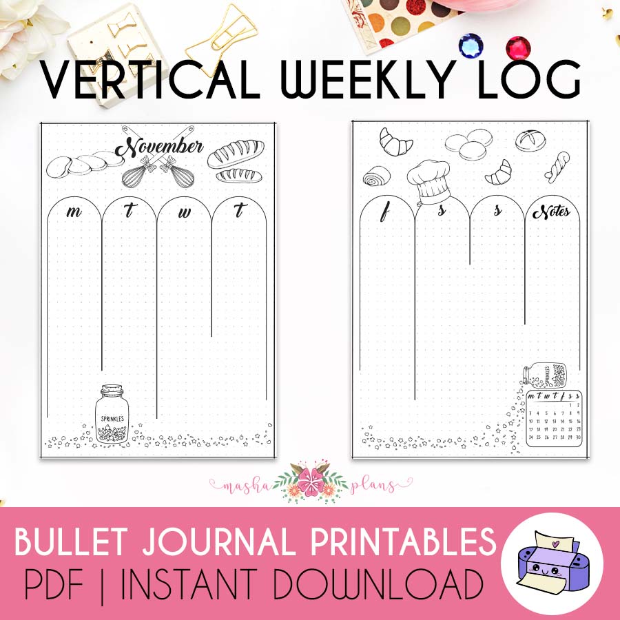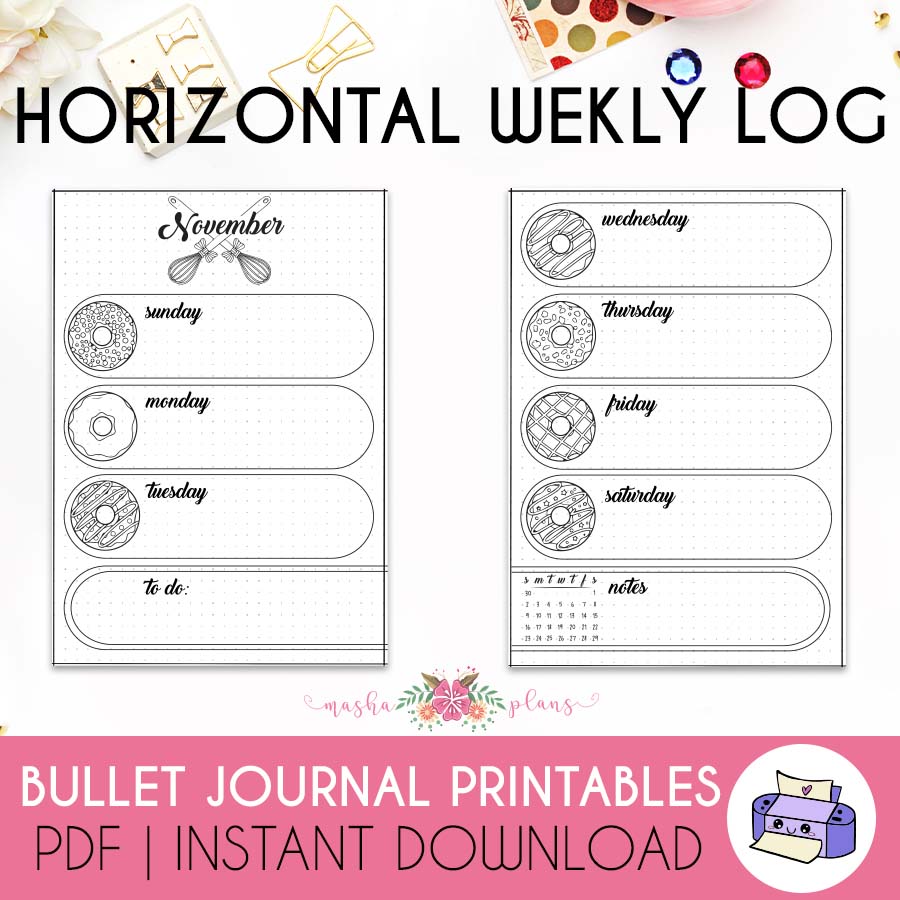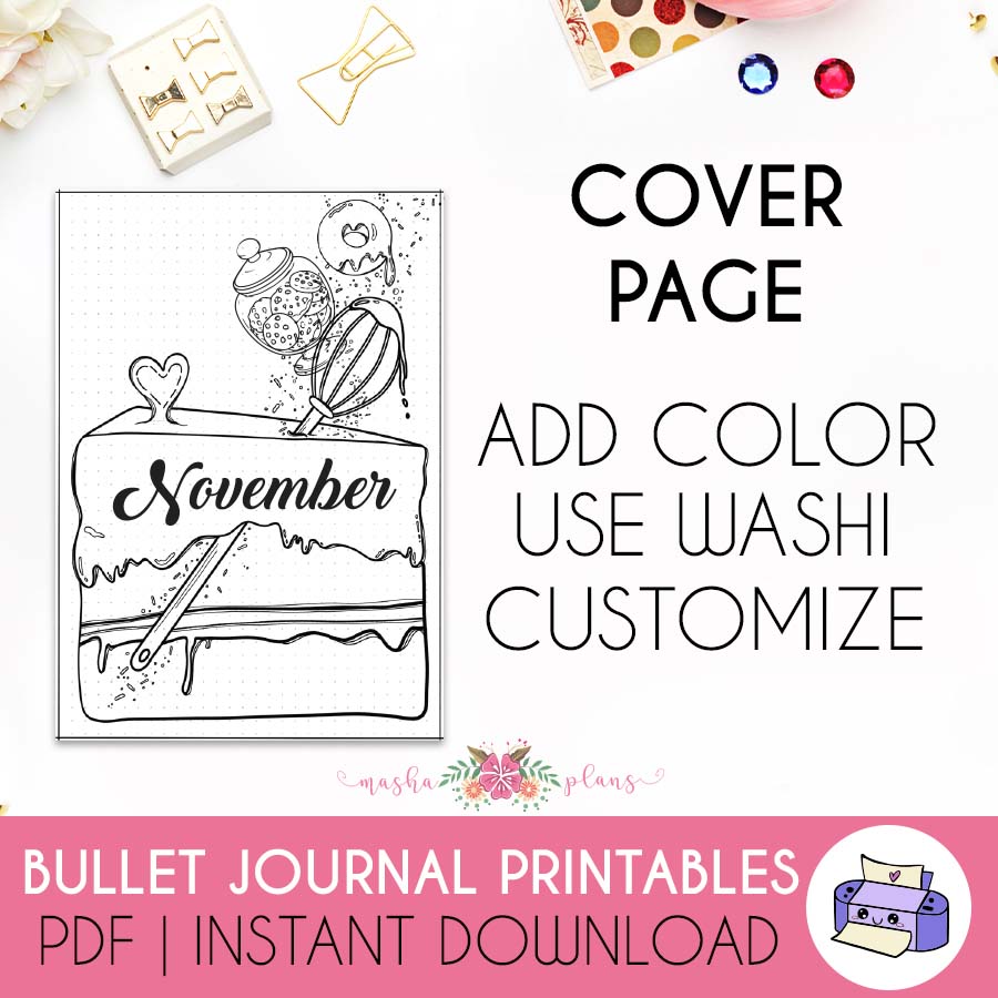 Hand-drawn printable November Bullet Journal setup. Available in Monday or Sunday start.